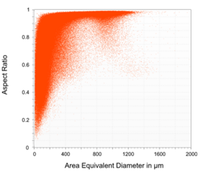 However, this representation does not show for which particle sizes certain Aspect Ratio values may occur preferentially, e.g. whether large particles tend to deviate from the perfect spherical shape more than smaller ones. This is where displaying the data in a 2D or even 3D Cloud is helpful. As an example, Figure 4 shows the same measurement as a 2D Cloud. Each measured particle generates a data point where the y value gives the Aspect Ratio and for x value the Area Equivalent Diameter is chosen. Of course, any other size (or even shape) parameter can also be used for the x axis.