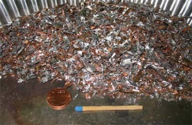 This task is solved with the FRITSCH Universal Cutting Mill PULVERISETTE 19l/50-700 rpm. The punching waste is a hard, abrasive material. Therefore hardmetal tungsten carbide cutting tools are used. Equipped with a 4 mm sieve, a chunky sample is obtained. The in this manner acquired material, can simply be filled into the melting pot and melted down. From the melt, a homogenous sample is easily taken.