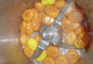 In order to identify vitamins or other ingredients of fruit flavoured hard candy according to the mandatory product labelling, usually the candy must be mechanically processed. The often utilized HPLC requires only weighted samples of a few milligrams though, in which a realistic random distribution of characteristic features of the sampling seem difficult. Problematic during the sample preparation are often the high content of sugars and the vitamin content. An embrittlement with liquid nitrogen seems therefore unavoidable, in order to change the breaking behaviour of the hard candy and to guarantee the temperature stability of the vitamins. All this can also be carried out with the Knife Mill PULVERISETTE 11. A beforehand conducted embrittlement in the stainless steel vessel, as well as only a brief comminution of 20 seconds at 5,000 rpm, create a finely distributed powder without a too high application of energy.