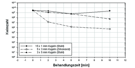 These two diagrams illustrate that the processing with the FRITSCH Mini-Mill PULVERISETTE 23 with the grinding figuration of 15 x 1 mm steel grinding balls and a grinding duration of 10 minutes yields excellent results in the area of the recovery rate of the biological main bacteria B. atrophaeus and the particle distribution of the testing dusts with the B.atropaeus-endospores. Here the degree of the filling of the grinding chamber with 15 x 1 mm grinding balls, which is defined from the ratio of the discharge volume of the idling grinding body discharge, to the volume of the grinding chamber, is very advantageous. This illustrates especially the particle size distribution of diagram 2.