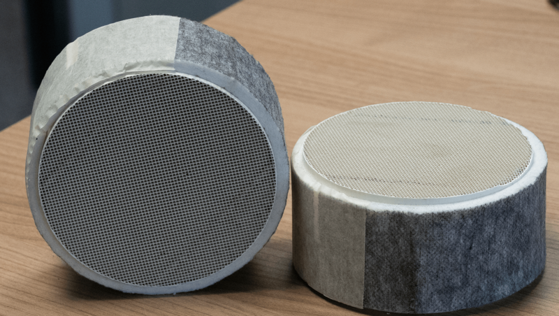 The automotive catalytic converter usually consists of several components. The carrier is a temperature-stable ceramic honeycomb body, usually cordierite, which has a large number of thin-walled channels. The so-called washcoat is located on the carrier. It consists of porous aluminum oxide (Al2O3) and serves to increase the surface area. Due to the high roughness, a large surface area of up to several hundred square meters per gram is realized. The catalytically active substances are embedded in the washcoat. These vary depending on the type of catalyst. In modern three-way catalysts, for example, these are the precious metals platinum, rhodium or palladium, or a combination of these.[1]